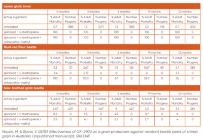 The table below presents data from a recent study at University of Queensland. Good control of adults and progenyof these key grain pests can be seen for at least nine months.