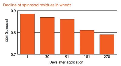Due to the slow degradation of Qalcova® active, in short to mid-term storage scenarios, the residue on the grain at out-turn will be at, or just below, the original level at treatment (i.e. at the Australian MRL) as indicated in the graph below (Corteva Agriscience™ internal trial).